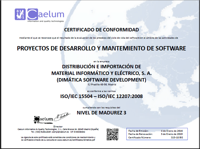 DIMATICA en su búsqueda de la mejora continua y la excelencia, obtiene la certificación ISO 15504 que confirma las Buenas Práscticas utilizadas en el Desarrollo de Software